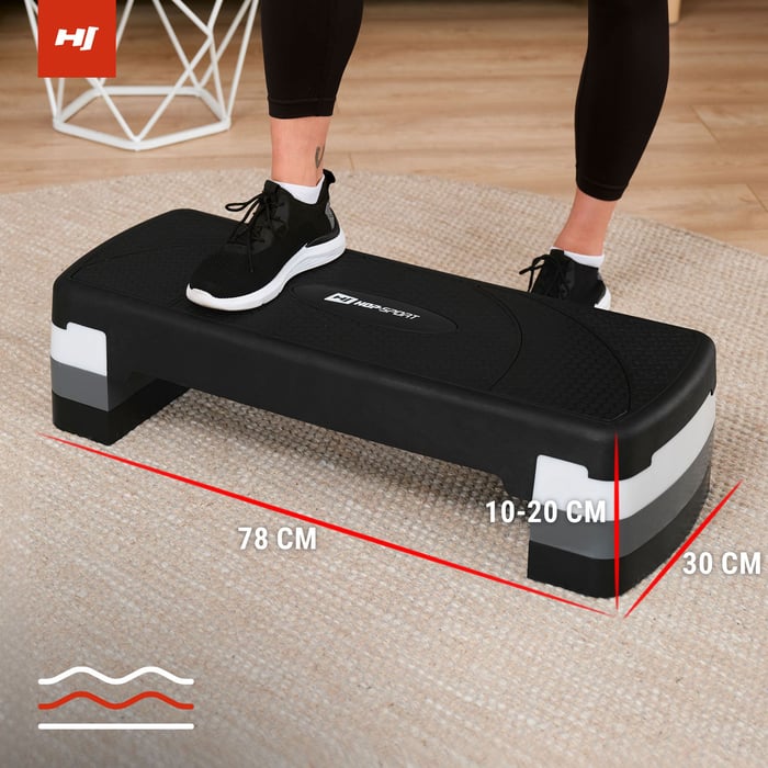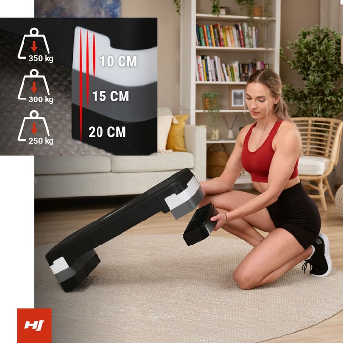 Prispôsobte si výšku stepu svojim potrebám a intenzite tréningu! Mostík Hop-šport ponúka tri úrovne nastavenia: 10 cm, 15 cm a 20 cm, čo vám umožní zvýšiť obtiažnosť vašich cvičení s postupom. Sila na každej úrovni je optimálne prispôsobená, aby bola zaistená úplná bezpečnosť: