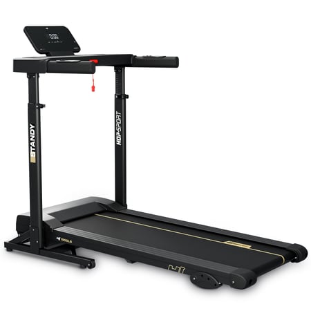 Na bežeckom páse Standy máš dostatok miesta na chôdzu aj beh prirodzeným, pohodlným krokom. Protišmykový povrch sa stará o istotu každého došľapu a nastaviteľný horný panel umožňuje prispôsobiť pás tvojej výške. V držadlách sú umiestnené senzory pulzu, takže jedným dotykom skontroluješ, ako pracuje tvoje srdce. Najväčším plusom je však možnosť panel vyklopiť a použiť ho ako pohodlný stojan na notebook. Vďaka tomu môžeš pracovať, pozerať seriál, viesť videohovor – a to všetko počas pokojnej chôdze. Je to skvelé riešenie, ak chceš dbať o zdravie, ale nemáš čas na samostatný tréning. Navyše tlačidlá rýchlej regulácie umožňujú meniť rýchlosť alebo sklon pásu.
