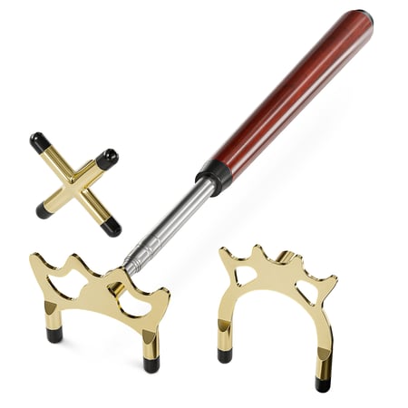 Teleskopické tágo s podperami: mostík, pavúk a kríž - slúžia na podopretie tága pri údere. Tieto podpery výrazne zlepšujú kvalitu a presnosť vašej hry. Teleskopické tágo je vyrobené z jaseňového dreva a kovu s mosadznými komponentmi a opory majú gumené podložky, ktoré zabraňujú ich šmýkaniu po súkne stola.