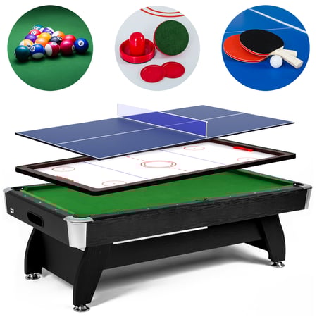 Čierny biliardový stôl so zeleným suknom, 7ft s obojstrannou doskou na ping-pong a vzdušný hokej. Príslušenstvo je súčasťou balenia.