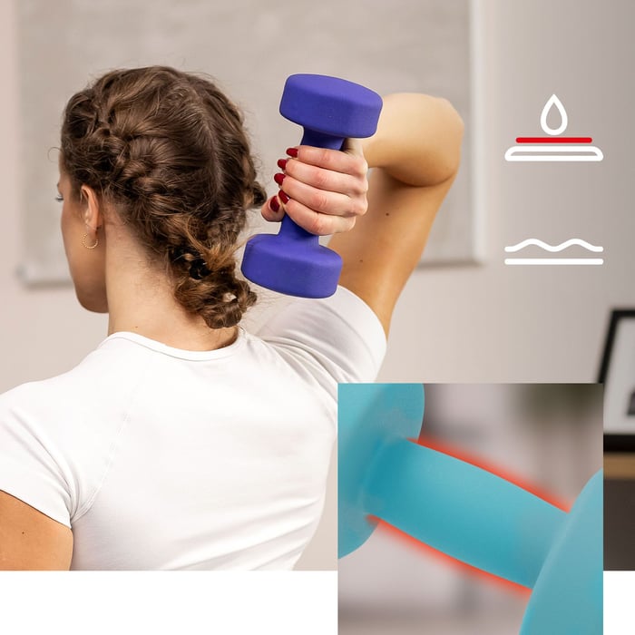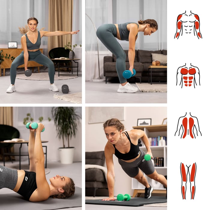 Súpravy neoprénových fitness činiek sú dostupné v hmotnostných kategóriách od 1 kg do 10 kg, čím máte možnosť neustáleho napredovania v tréningu. Rôzne farby závaží uľahčujú identifikáciu hmotnosti a rýchlu výmenu činiek medzi jednotlivými sériami cvikov.