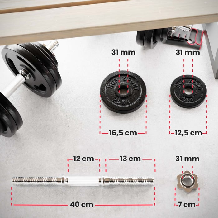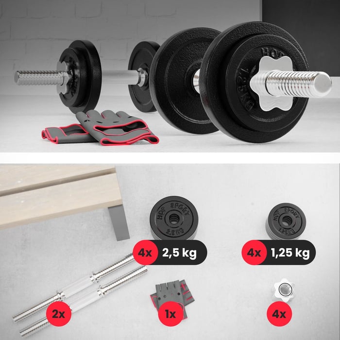 Túžite po zlepšení vzhľadu svojho tela a posilnení svalov rúk a hornej časti tela? Bezpečné činky na cvičenie značky Hop-Sport s celkovou hmotnosťou 20 kg Vám pomôžu dosiahnuť plánované efekty bez rizika zranenia. Sada zahŕňa liatinové kotúče, dve hriadele a bezpečnostné objímky. Činková oska so závitom má protišmykové, vrúbkované úchopy a môžte tak hriadel pevne držať pri cvičení. Protišmykové úchopy zaručujú perfektnú stabilitu činky v ruke aj pri intenzívnejších cvičeniach. Jednoručné činky z ponuky Hop-sport sú vhodnou voľbou pre začiatočníkov, ale aj pokročilých.