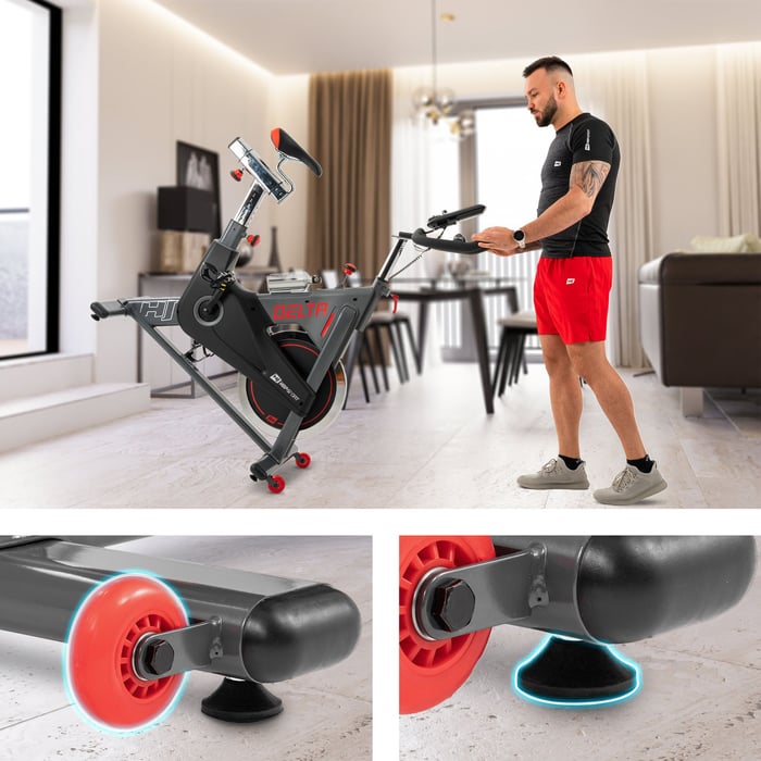 Je ťažký? Nemáte silu ho premiestniť? Zabudnite na to! Cyklotrenažér Delta je vybavený špeciálnymi transportnými kolieskami, ktoré uľahčujú jeho premiestňovanie. A vďaka vyrovnávacím nožičkám môžete rotoped stabilne umiestniť kdekoľvek vo vašom dome alebo byte, dokonca aj na nerovnom povrchu.