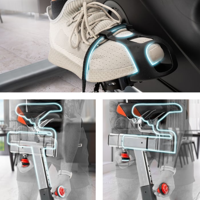 Pohodlne sa usaďte a užite si tréning! Sedadlo s vertikálnym a horizontálnym nastavením zaistí vaše pohodlie. Masívne kovové pedále s bezpečnostnými popruhmi zaručujú vašu bezpečnosť. Navyše, upevnenie nôh do nich zapojí svaly na nohách pre ešte väčšiu námahu.