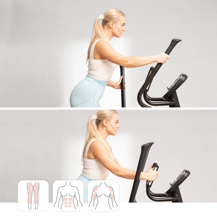 Každá z rukovätí eliptického trenažéra HS-250CF Jucon umožňuje rôzne postavenie rúk a tým zapojenie do práce rôznych svalových skupín počas tréningu. Menšie úchopy slúžia na prepracovanie spodných častí tela, najmä nôh a zadku. Veľké rukoväte so šírkou až 83 cm dávajú možnosť maximálnej aktivácie svalov ramien, a tým vykonávať dynamický kardio tréning. O hladký a tichý chod zariadenia sa stará systém magnetického odporu na báze 24 kg zotrvačníka.