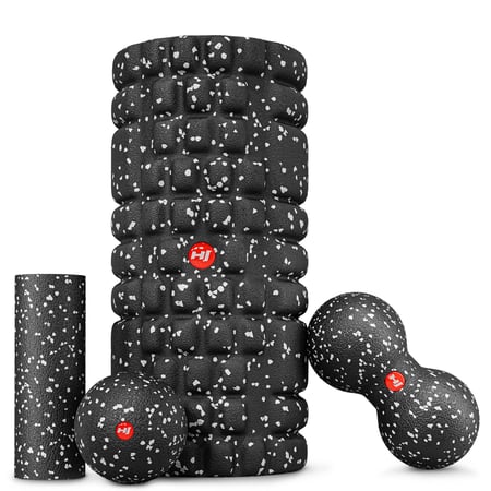 Sada čierno-bieleho masážneho príslušenstva skladajúci sa z masážneho valca, mini valčeka, masážnej loptičky a dvojitej masážnej loptičky je kompletnou sadou, ktorá vám umožní masírovať všetky svaly vášho tela. Rôzne tvary a veľkosti jednotlivých doplnkov v sade zaručujú dokonalé prispôsobenie vybraným partiám tela, kde cítite napätie alebo bolesť. Veľký valec sa bude skvele hodiť na masáž chrbta, dvojitá masážna loptička bude nenahraditeľná pri masáži šije a mini valček skvele premasíruje Achillovú šľachu. Vyrobené z pevných materiálov, ktoré sú šetrné k pokožke a zaisťujú pohodlie a bezpečnosť používania.