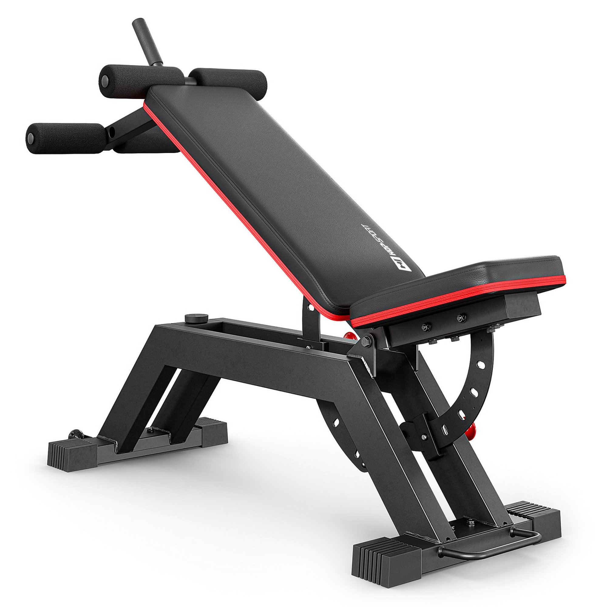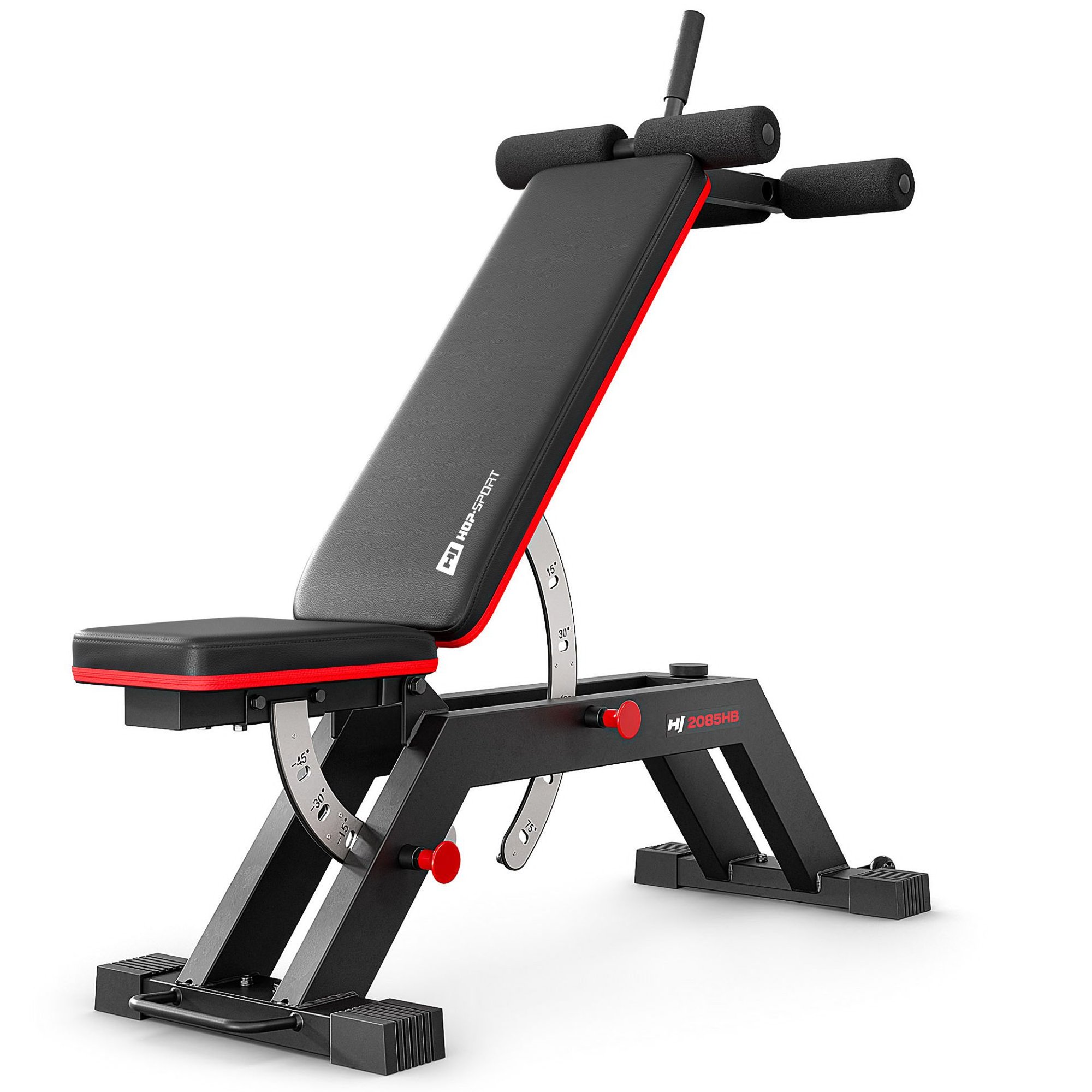 Tréningová lavica HS-2085HB s nastaviteľným operadlom a sedadlom, nosnosť do 300 kg. Multifunkčná, so stabilnou konštrukciou.