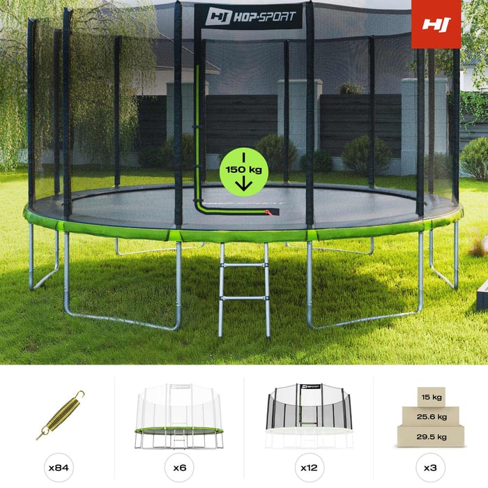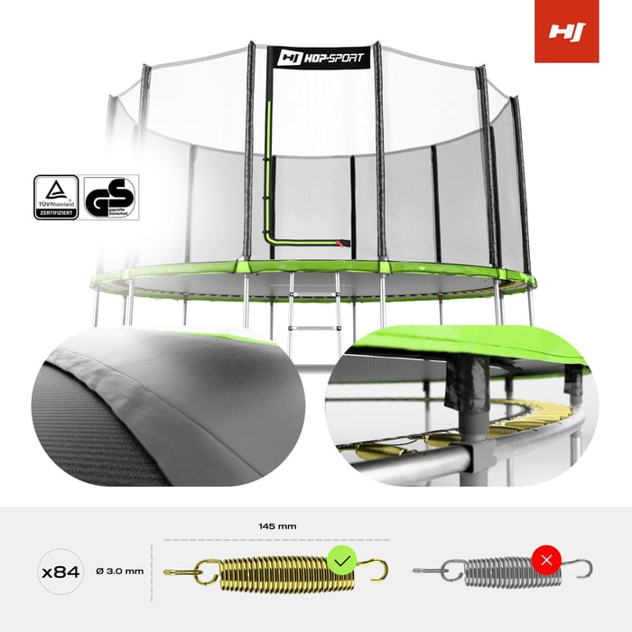 Trampolína Hop-Sport je synonymom najvyššej kvality a bezpečnosti, čo potvrdzuje prestížny certifikát TÚV. Jeho pevná konštrukcia je vyrobená z pozinkovanej tvrdenej ocele, ktorá zaisťuje nielen stabilitu pri tých najenergickejších skokoch, ale taktiež zaručuje odolnosť proti korózii a mechanickému poškodeniu. Vďaka tomu si trampolína zachová svoje vlastnosti po mnoho sezón a poskytne množstvo zábavy pre celú rodinu.
